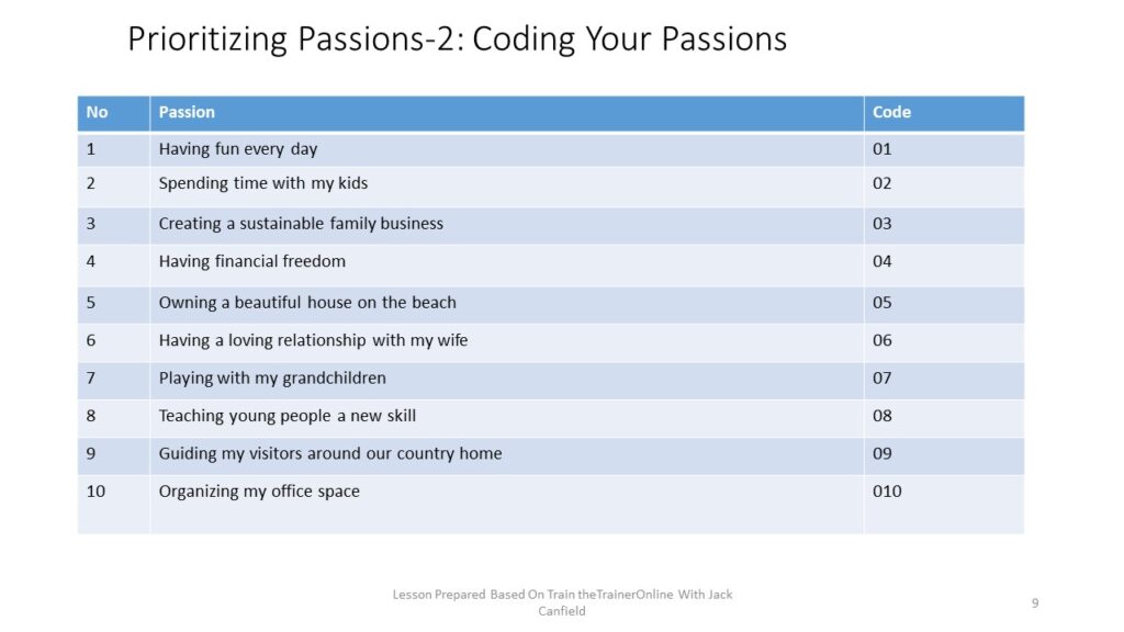 Next you are going to give each of your passions an identification number or code. This code begins with the digit zero (0) to differentiate it from any other numbers in the list. So you will have 01, 02, 03—010 as codes. See the codes given to the passions in the example shown in the table below