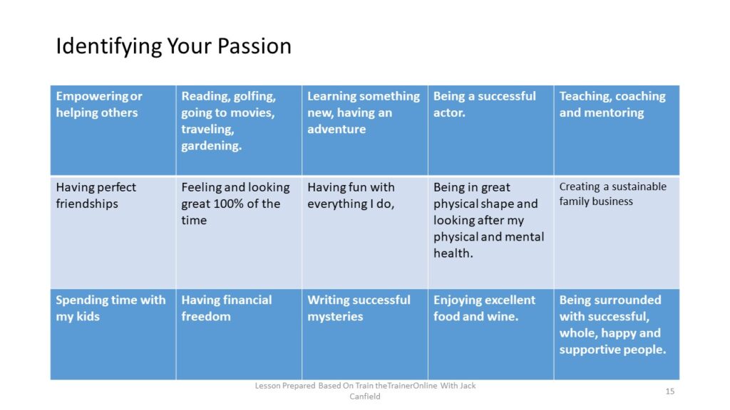 Do not bundle passions. Make each passion distinct. For example don’t say I want to have a loving relationship with my partner, my children and my colleagues. Pick one and say for example “I want a loving relationship with my partner”. In writing your passion start with the statement: My life is at its best when I am—- e.g.