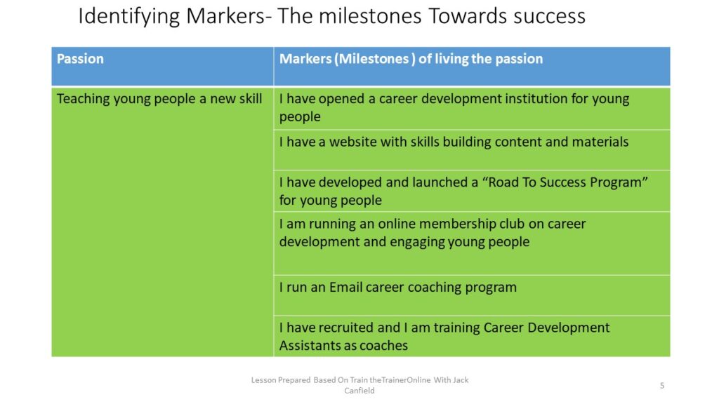 In this exercise we are going to choose one passion and identify the markers of living the passion. These are milestones that show that you are living that passion. The Table below shows the selected passion and the examples of markers that show you are actively living the passion