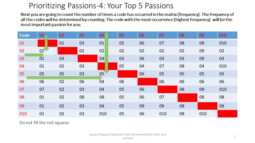 You are now going to determine which of the 10 passions you have listed makes it to the top 5 passions in your life. To illustrate this we are going to list 10 examples of passions and then prioritize them by using A pairsway matching tool. In this exercise two passions are matched at a time and you make a decision on which of the two is more important. The code of the more important passion to you is written in the appropriate square in the matrix. This is done across all the 10 passions until the squares are all filled with codes of the passions. The codes are them counted. The most frequently occurring code is put on the top of the list followed by the second, third , fourth and fifth most frequent codes.