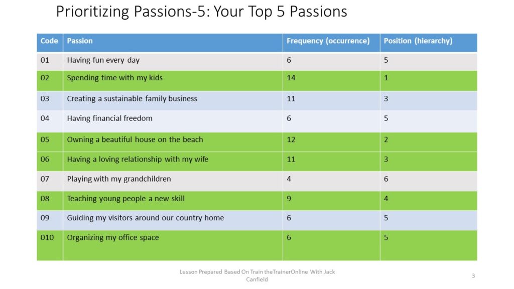 The Table below shows that “Spending time with my kids (code 02)”, is the most important passion, followed by “owning a beautiful house on the beach (code 05), having a loving relationship with my wife (code 06), Teaching young people a new skill (code 08) and organizing my office space (code 010). Please note that there were several ‘ties’ in the positions. These five top passions  show where you are going to put your attention or focus. It does not mean the rest are not important