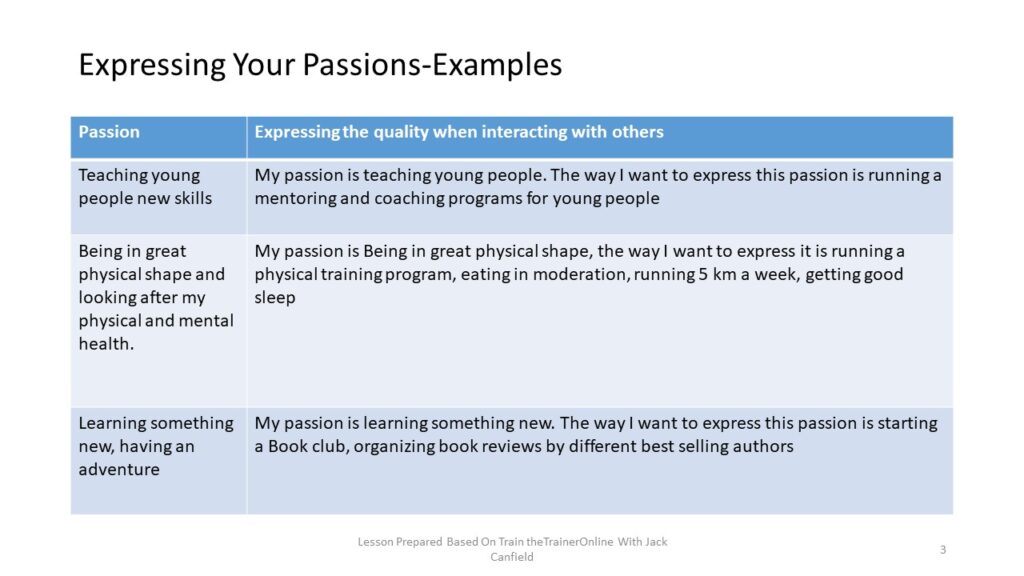 There are several ways you express your passions when you are interacting with others. For example if your passion is ‘spending time with the kids’ you may be expressing it through running a ‘Sunday school program for kids’. See examples below: