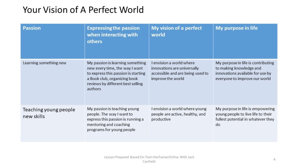 1. Combine all the three answers above into a single statement-Your Life purpose statement. For example: My passion is “Teaching young people”. The way I want to express is coaching, mentoring, ‘inspiring’ and ‘empowering’ theme. My vision of a perfect world is a world where young people are ‘living their highest vision’. So my life purpose can be summarized as: “Empowering and inspiring young people to live their highest vision”