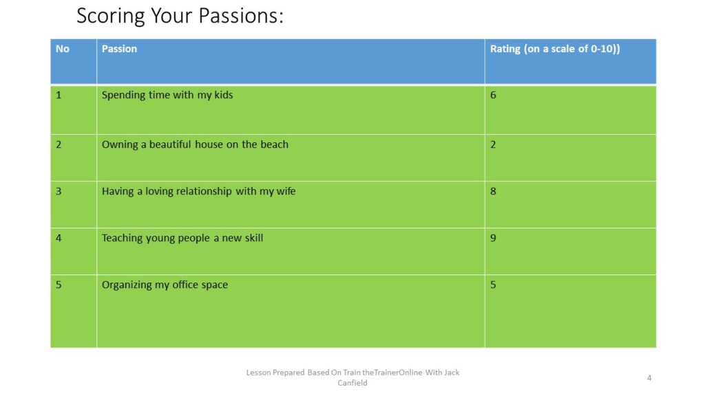 After finding your  top 5 passions you are going to rate each one on a scale of 0 to 10, where 0 means this passion is not present in your life at all, and 10 means you are fully living this passion. The result of your rating may look like is shown in the table below