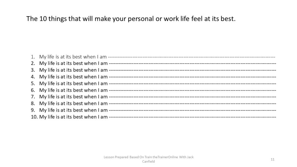 We are going to identify those things that are most important, the 10 things that will make your personal or work life feel at its best. These are also called Your Passions. If you were fully living these things, you would feel happy, fulfilled and complete. Please complete the sentence, “My life is at its Best when I am …..e.g. having dinner with my family or “My life is at its Best when I am …..e.g. watching a love movie with my wife. Start…
